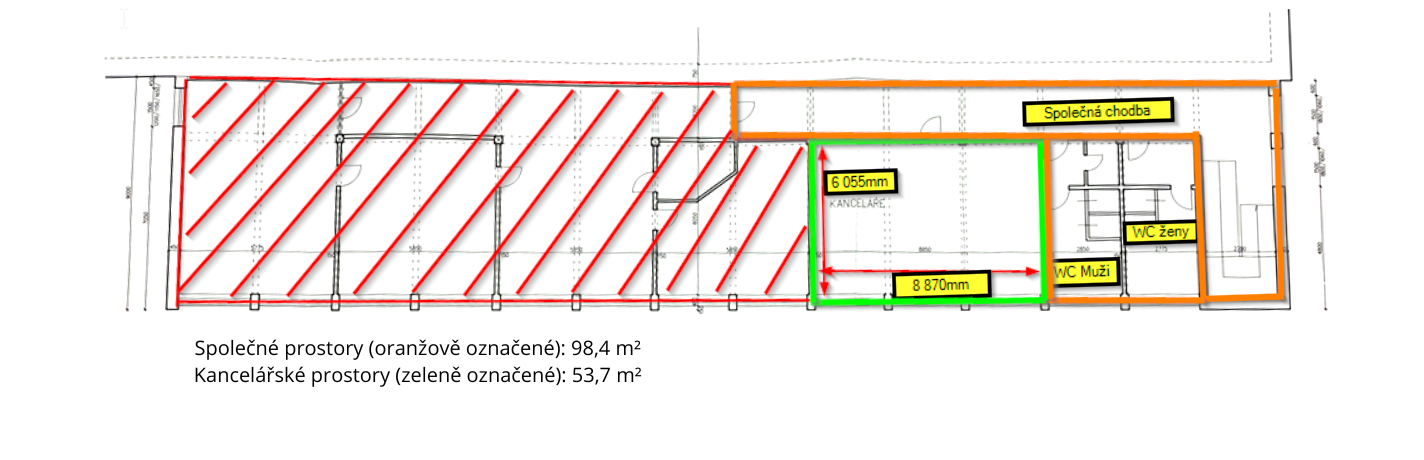 Prostory se nachází v 1. nadzemním podlaží a jsou aktuálně členěny na kancelář a příruční sklad. V případě potřeby lze příčku odstranit a prostor opět využívat jako jednu velkou kancelář. Na chodbě je k dispozici sociální zázemí (2 toalety).